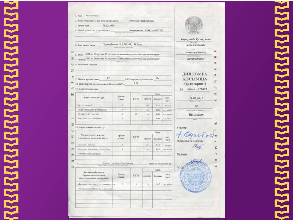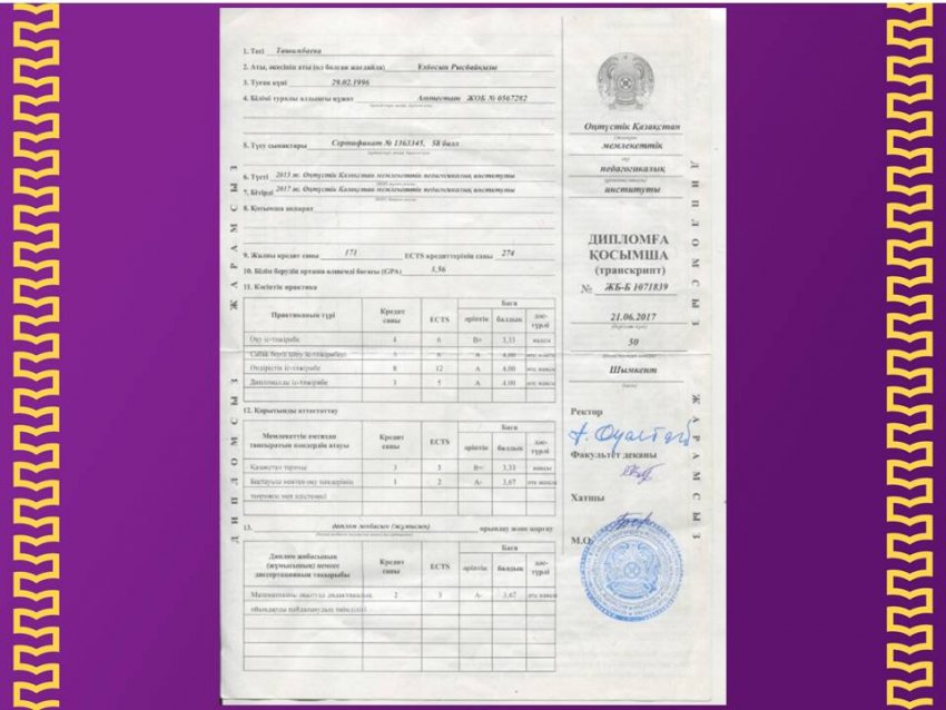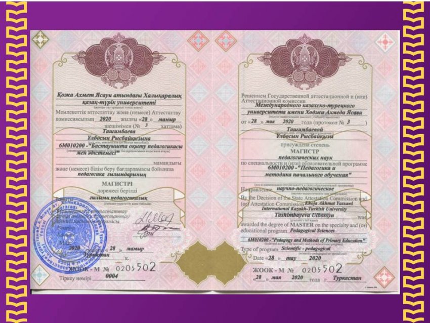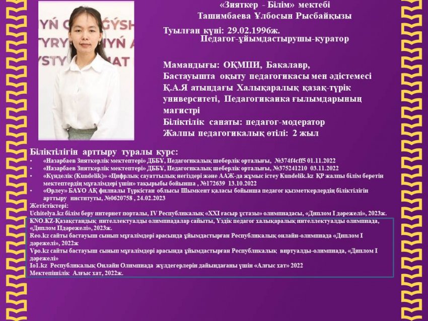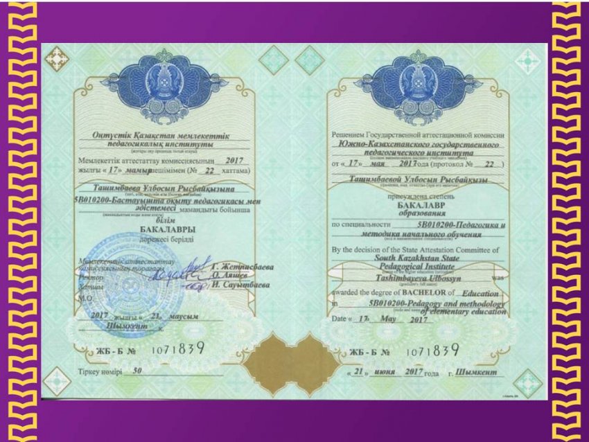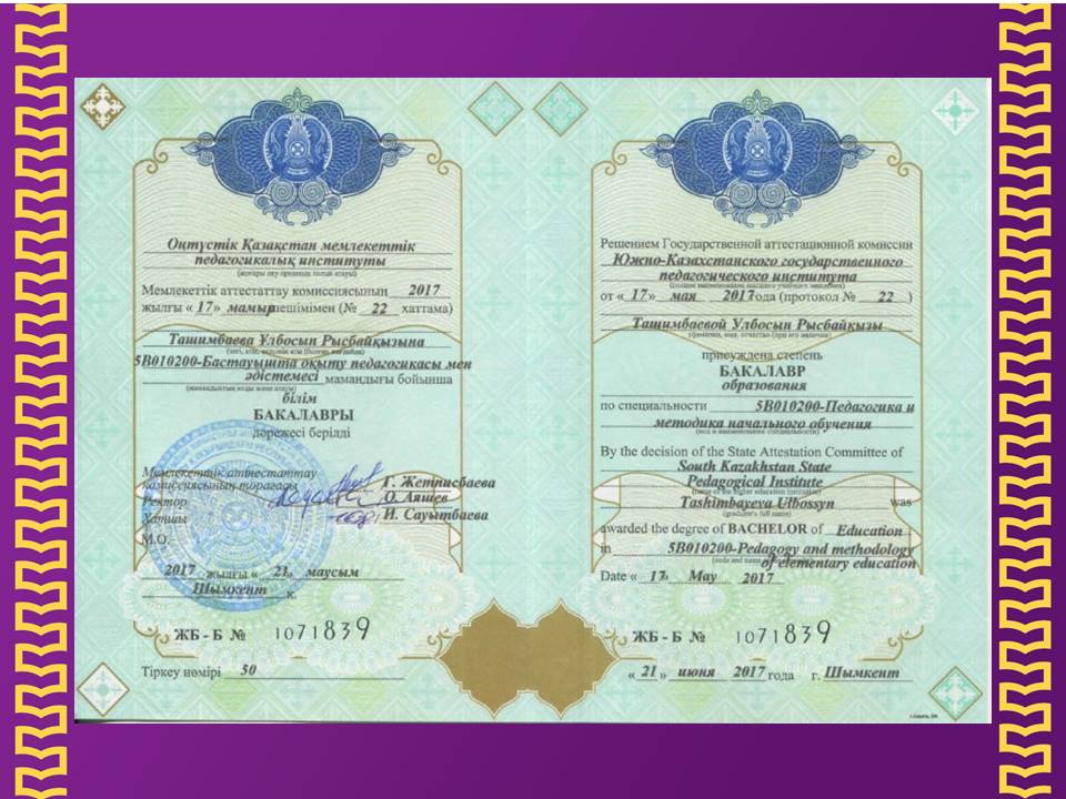 Мамандығы: ОҚМПИ, Бакалавр,Бастауышта оқыту педагогикасы мен әдістемесі
