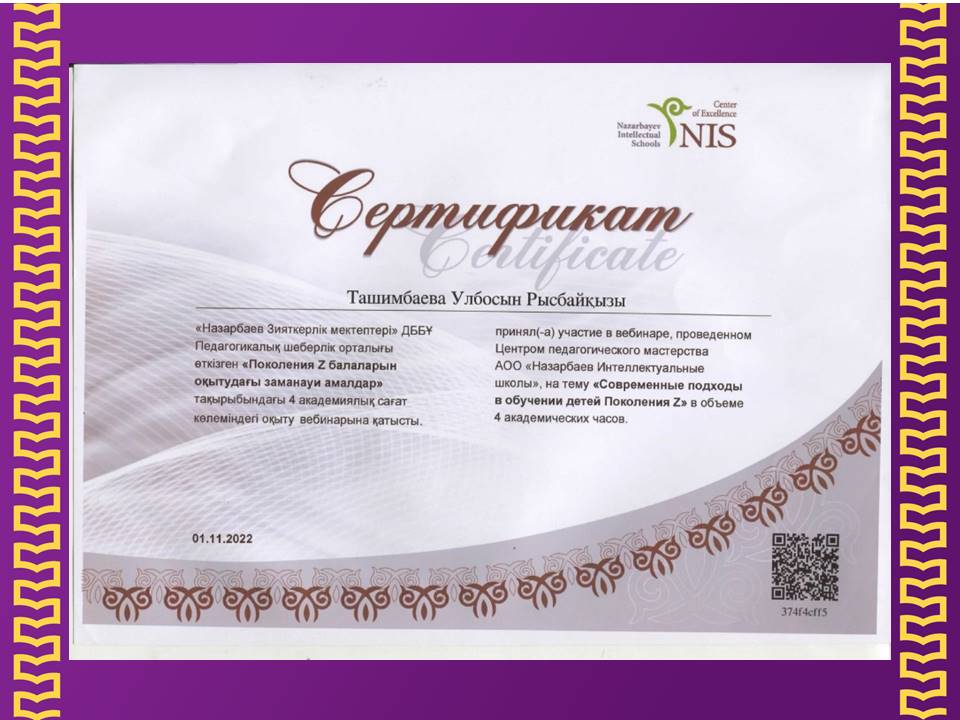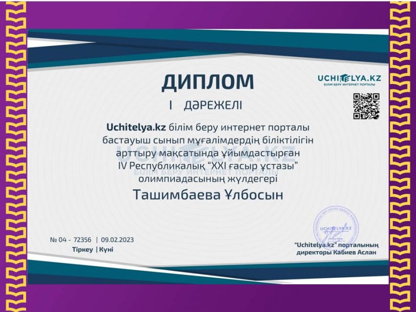 Uchitelya.kz білім беру интернет порталы, IV Республикалық «ХХІ ғасыр ұстазы» олимпиадасы, «Диплом І дәрежелі», 2023ж.