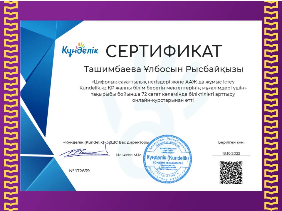 «Күнделік (Kundelik)» «Цифрлық сауаттылық негіздері және ААЖ-да жұмыс істеу Kundelik.kz ҚР жалпы білім беретін мектептердің мұғалімдері үшін» тақырыбы бойынша , №172639 13.10.2022