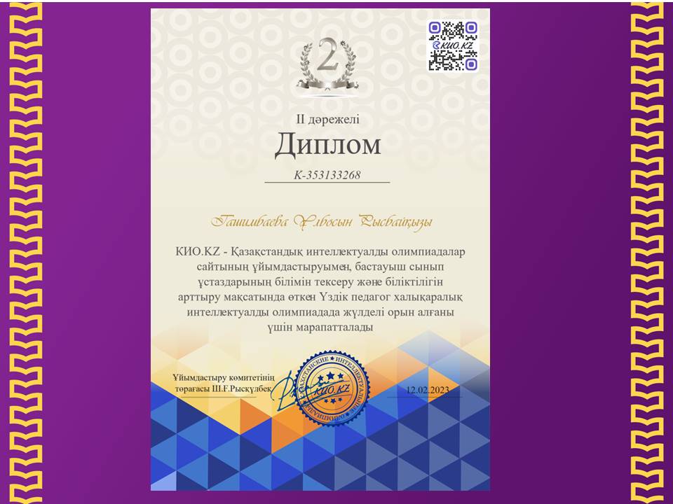 KNO.KZ-Қазақстандық интеллектуалды олимпиадалар сайыты, Үздік педагог халықаралық интеллектуалды олимпиада, «Диплом ІІдәрежелі», 2023ж.