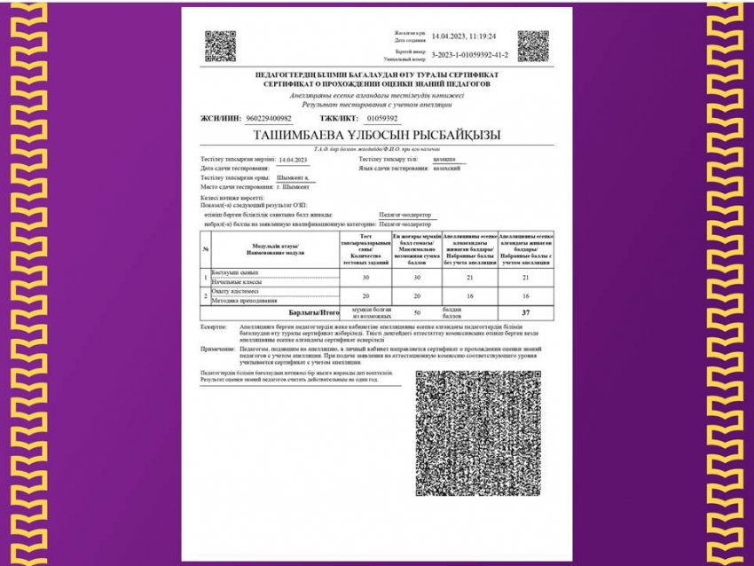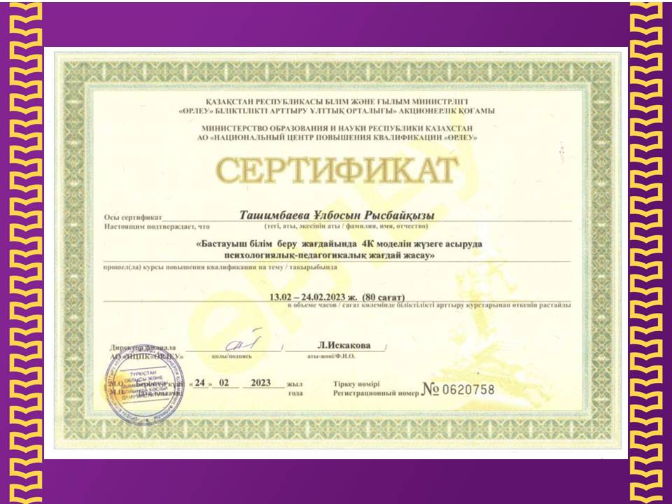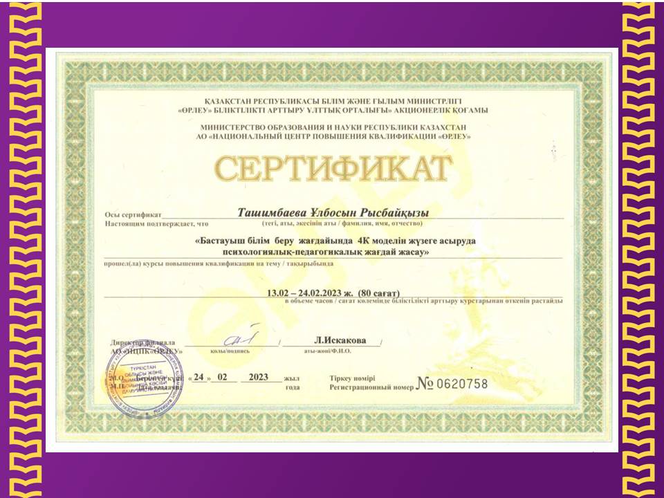 «Өрлеу» БАҰО АҚ филиалы Түркістан облысы Шымкент қаласы бойынша педагог қызметкерлердің біліктілігін арттыру институты, №0620758 , 24.02.2023