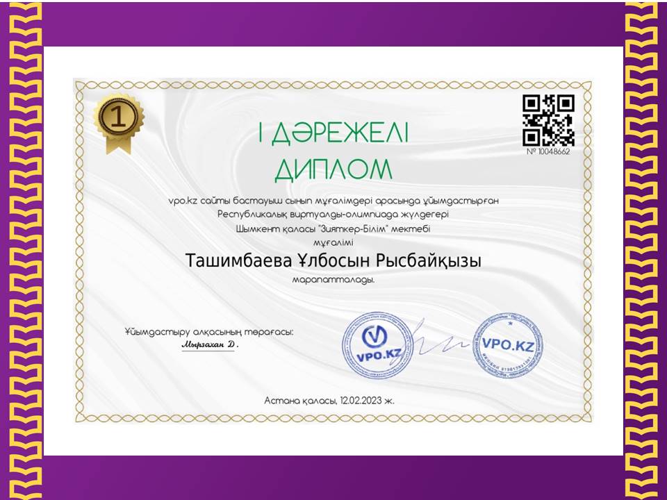 Vpo.kz сайты бастауыш сынып мұғалімдері арасында ұйымдастырған Республикалық виртуалды-олимпиада, «Диплом І дәрежелі»
