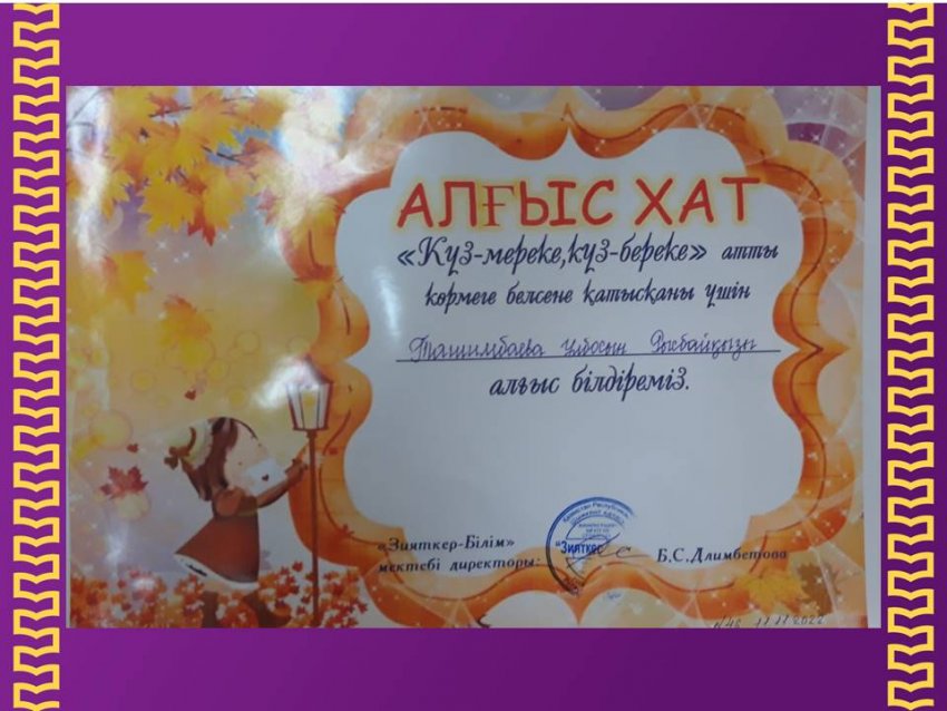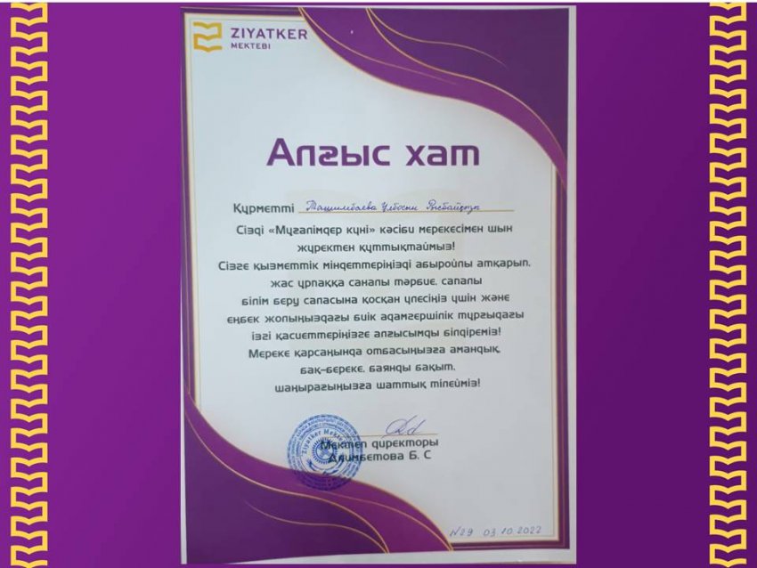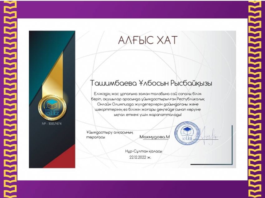 Іо1.kz Республикалық Онлайн Олимпиада жүлдегерлерін дайындағаны үшін «Алғыс хат» 2022