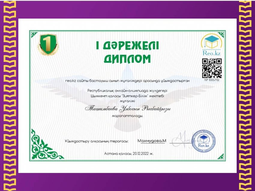 Reo.kz сайты бастауыш сынып мұғалімдері арасында ұйымдастырған Республикалық онлайн-олимпиада «Диплом І дәрежелі», 2022ж