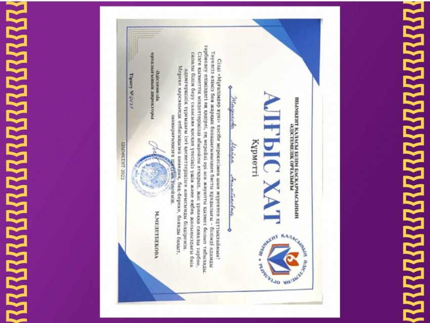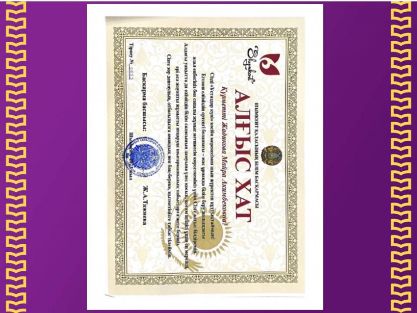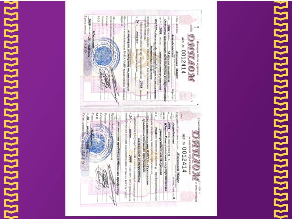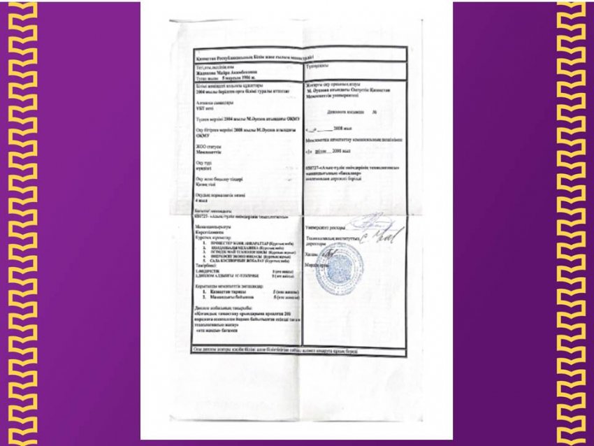 Мамандығы: М.Әуезов атындағы ОҚМУ, Бакалавр, Азық-түлік өнімдерінің технологиясы.