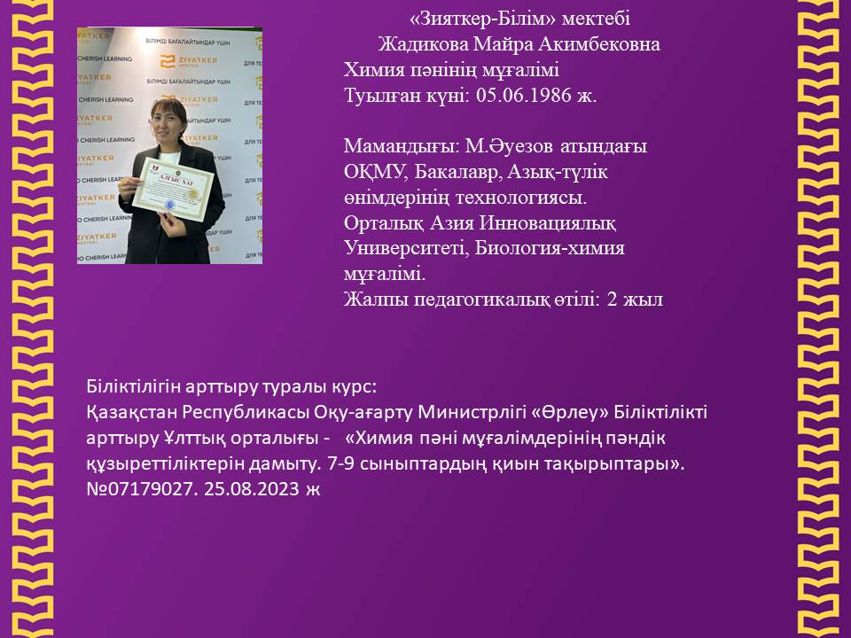 Химия пәнінің мұғаліміТуылған күні: 05.06.1986 ж.