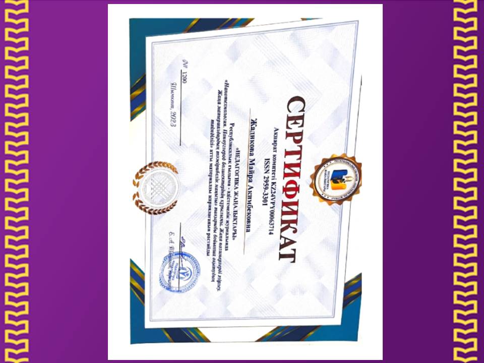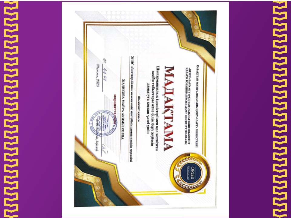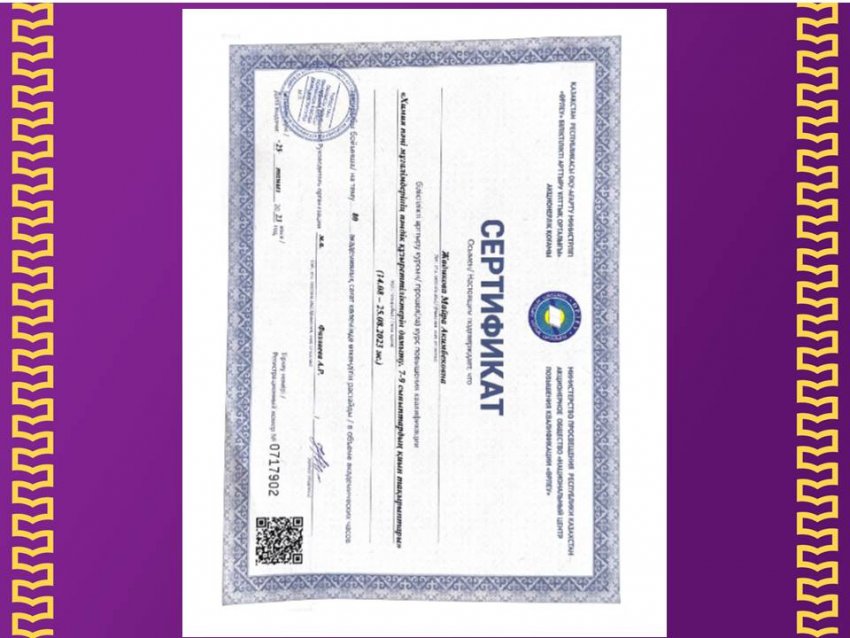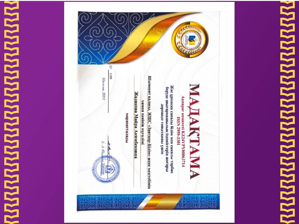 Қазақстан Республикасы Оқу-ағарту Министрлігі «Өрлеу» Біліктілікті арттыру Ұлттық орталығы - «Химия пәні мұғалімдерінің пәндік құзыреттіліктерін дамыту. 7-9 сыныптардың қиын тақырыптары». №07179027. 25.08.2023 ж