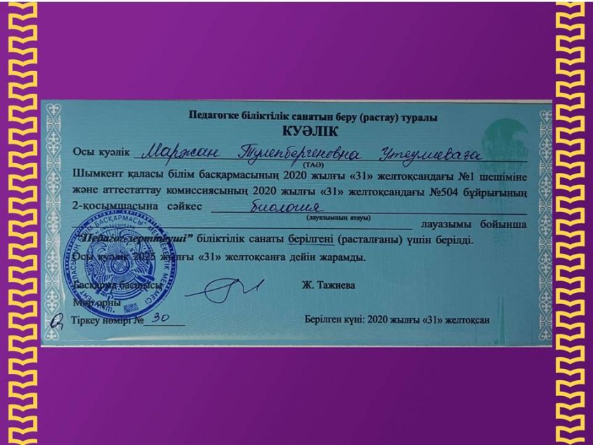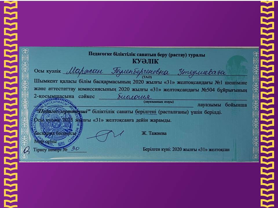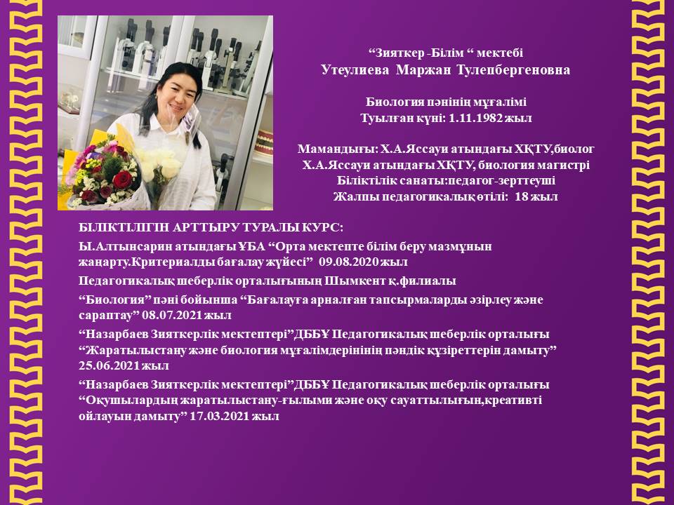 Биология пәнінің мұғаліміТуылған күні: 1.11.1982 жыл