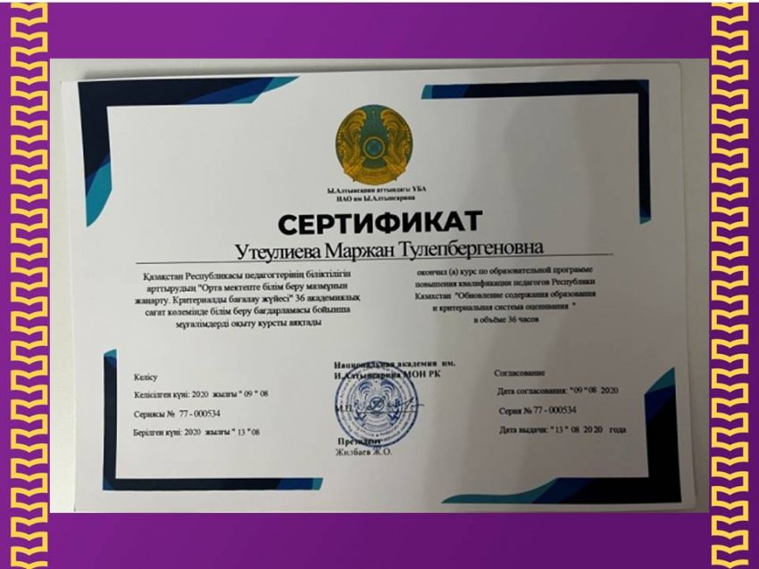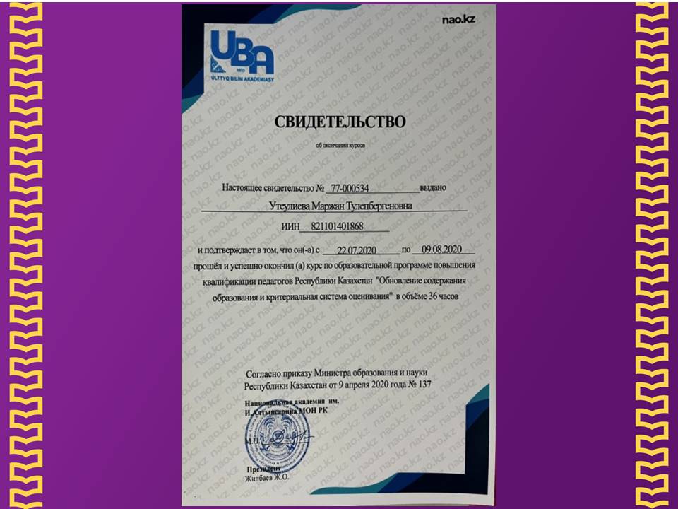 Ы.Алтынсарин атындағы ҰБА “Орта мектепте білім беру мазмұнын жаңарту.Критериалды бағалау жүйесі” 09.08.2020 жыл