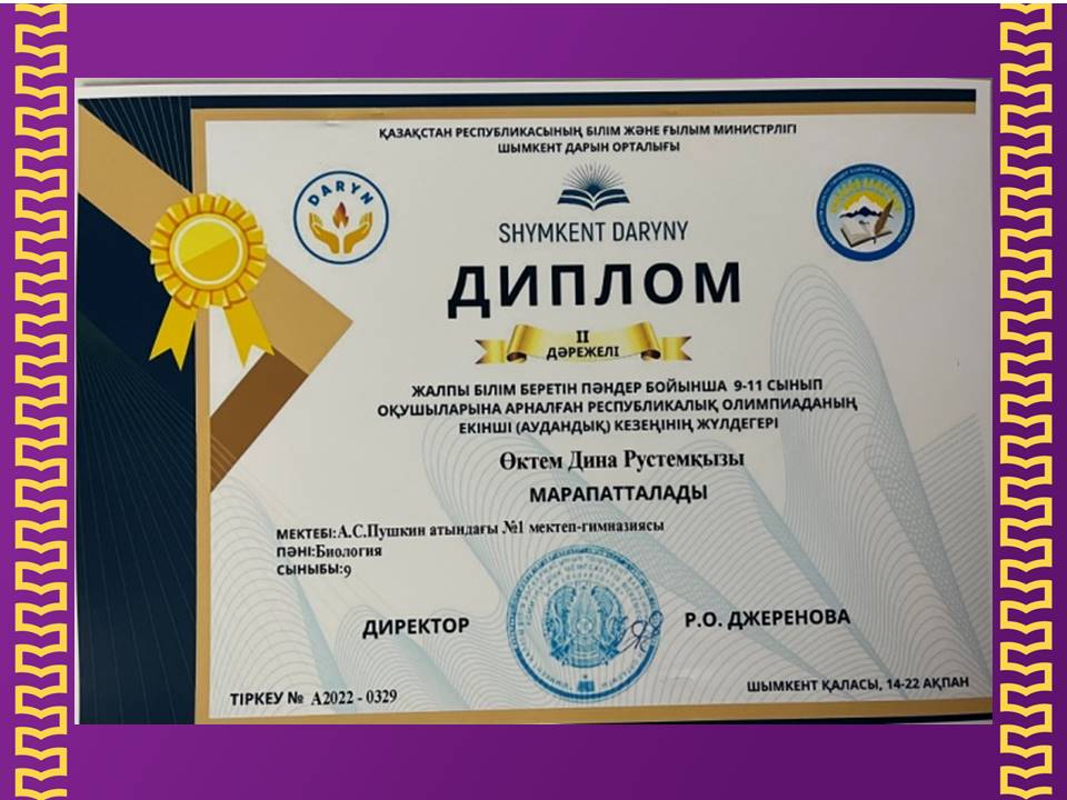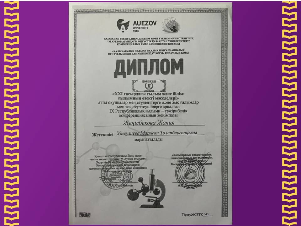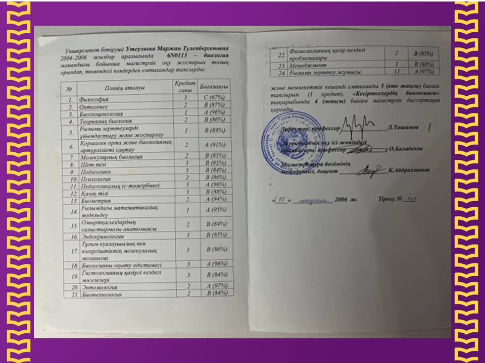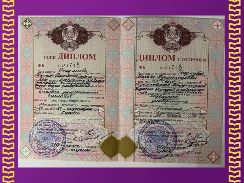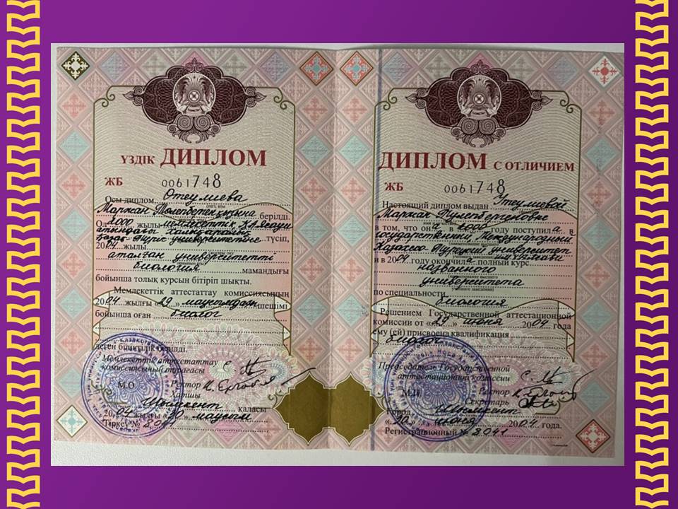 Мамандығы: Х.А.Яссауи атындағы ХҚТУ,биолог