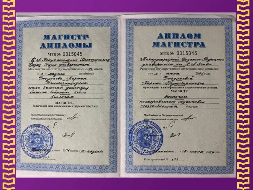 Х.А.Яссауи атындағы ХҚТУ, биология магистрі