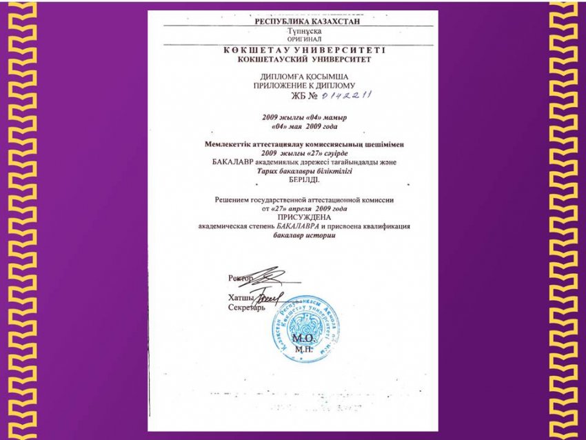 2004 жылы Қ.А.Ясауи атындағы Халықаралық Қазақ-Түрік университетіне түсіп 2009 жылы Көкшетау университетінің "Тарих" мамандығы бойынша жоғарғы білім берудің кәсіптік оқу бағдарламасын толық меңгеріп шықты.