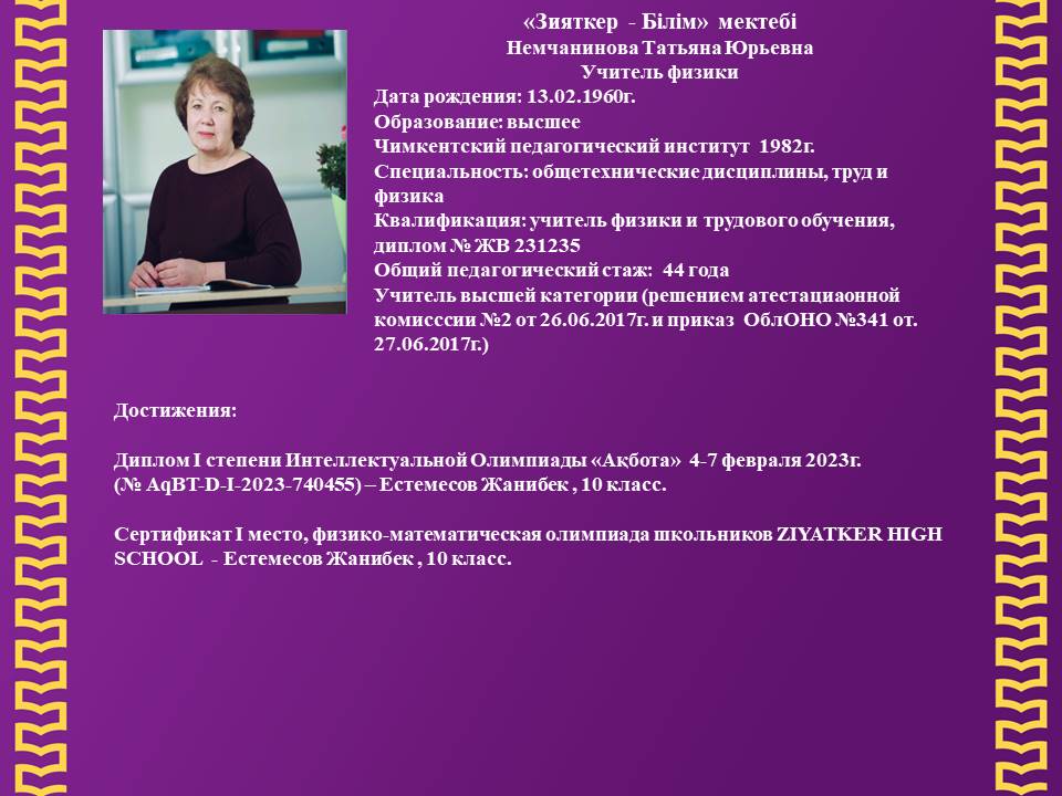 Физика пәнінің мұғалімі » «Зияткер-Білім» мектебі