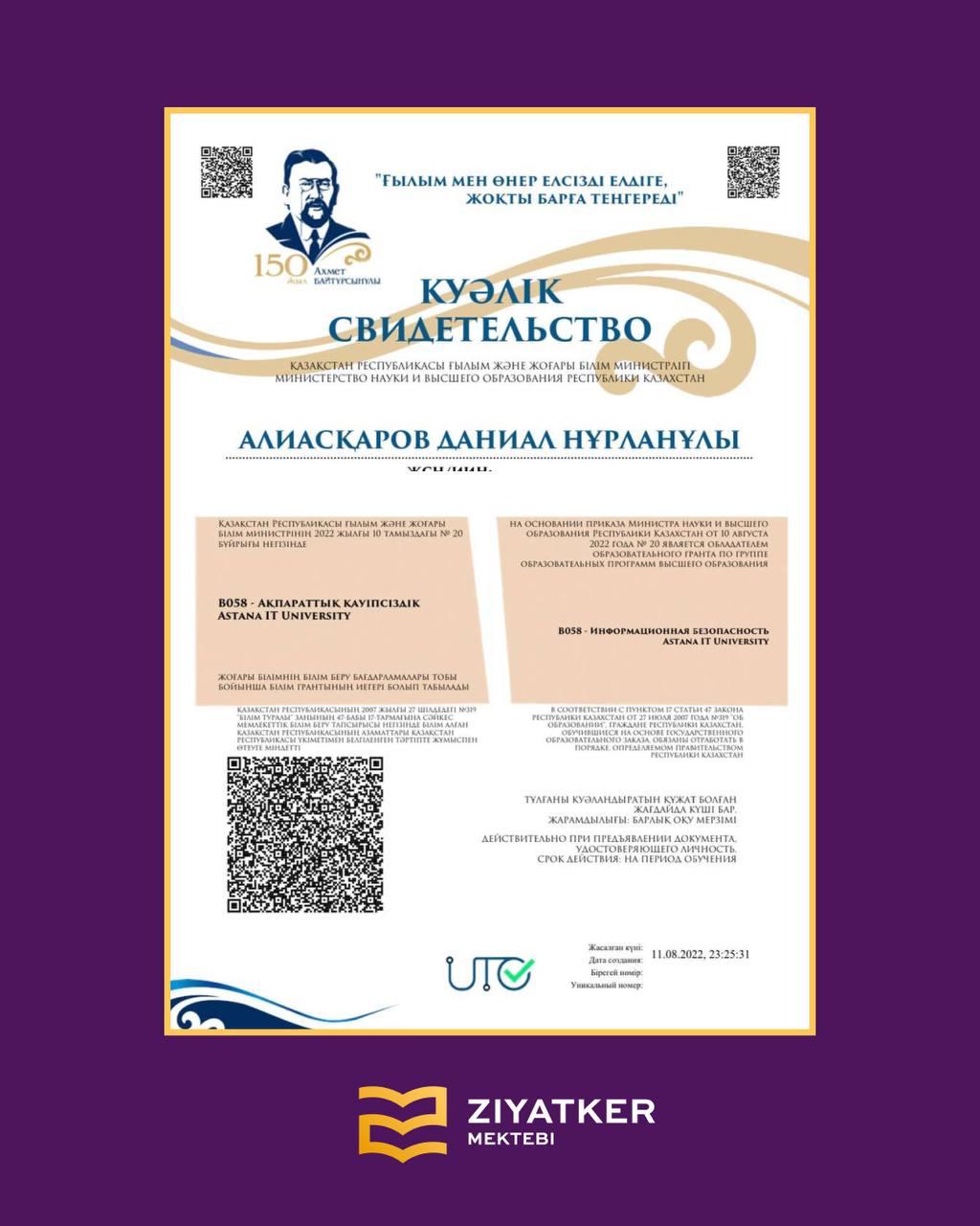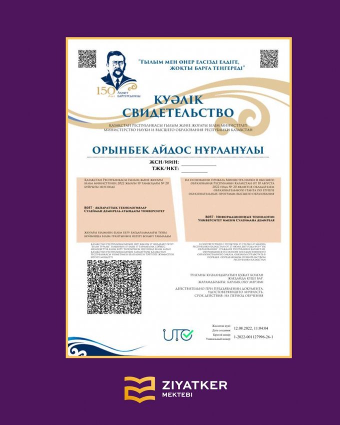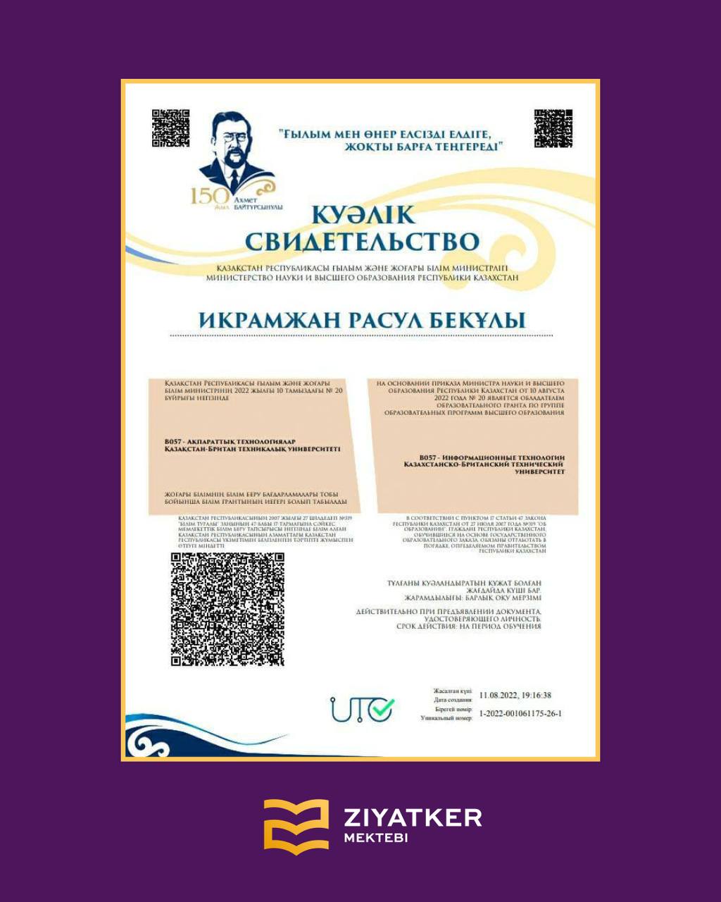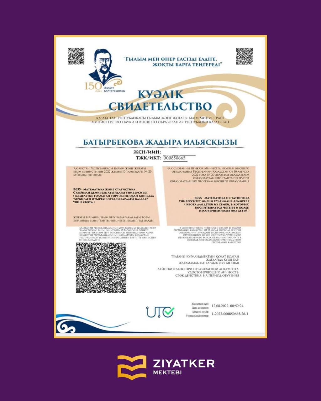 Түлектеріміздің университетке түскендігі туралы куәліктері » «Зияткер-Білім» мектебі