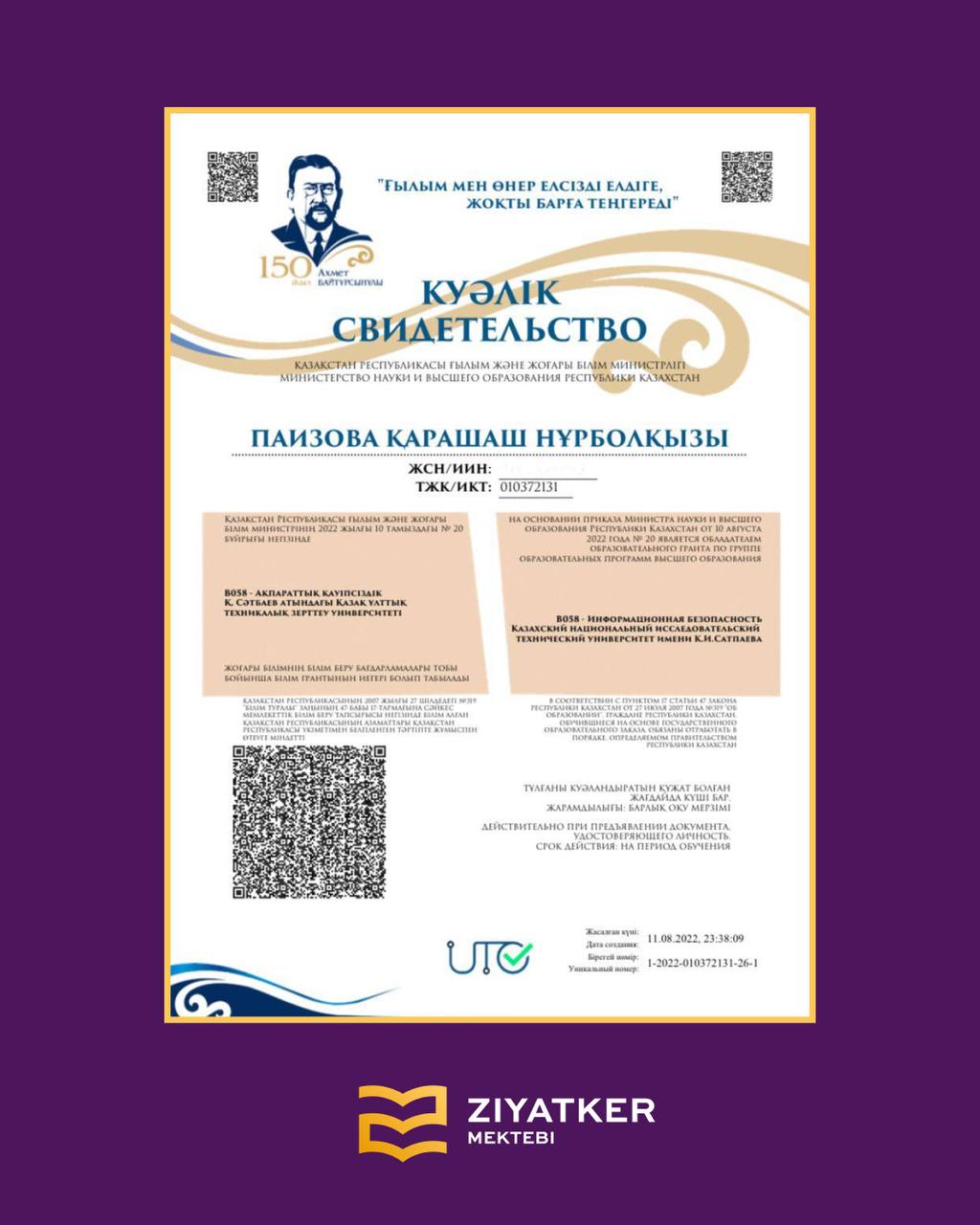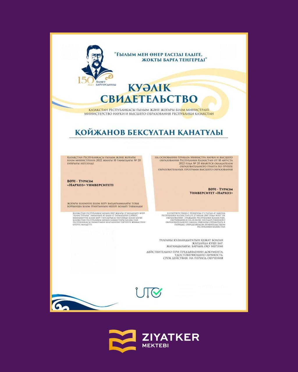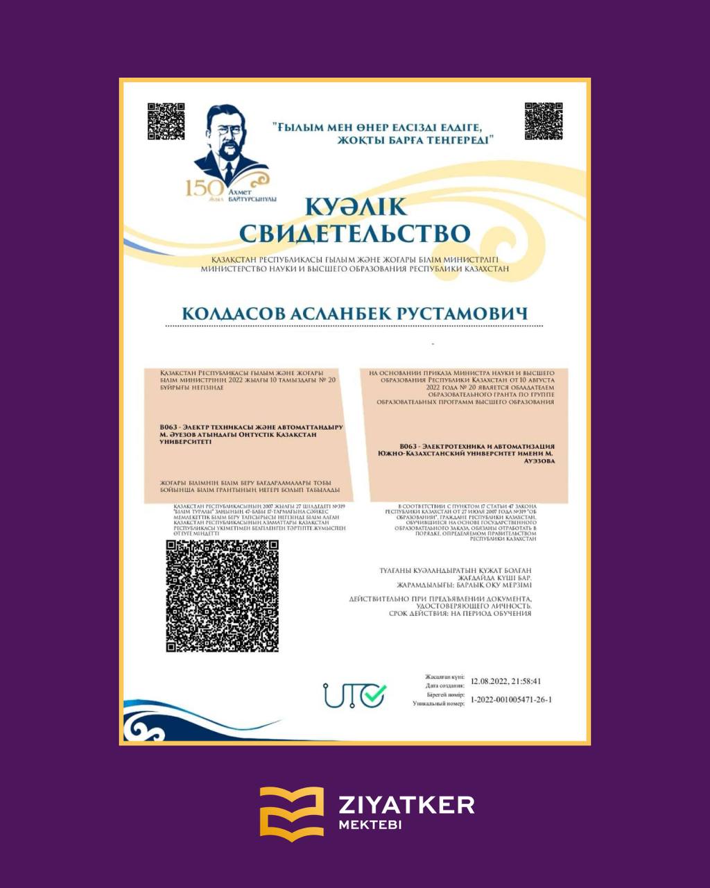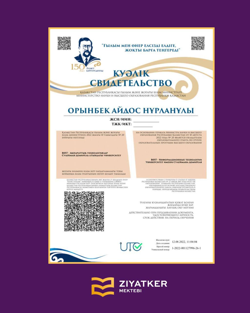 » » » Түлектеріміздің университетке түскендігі туралы куәліктері