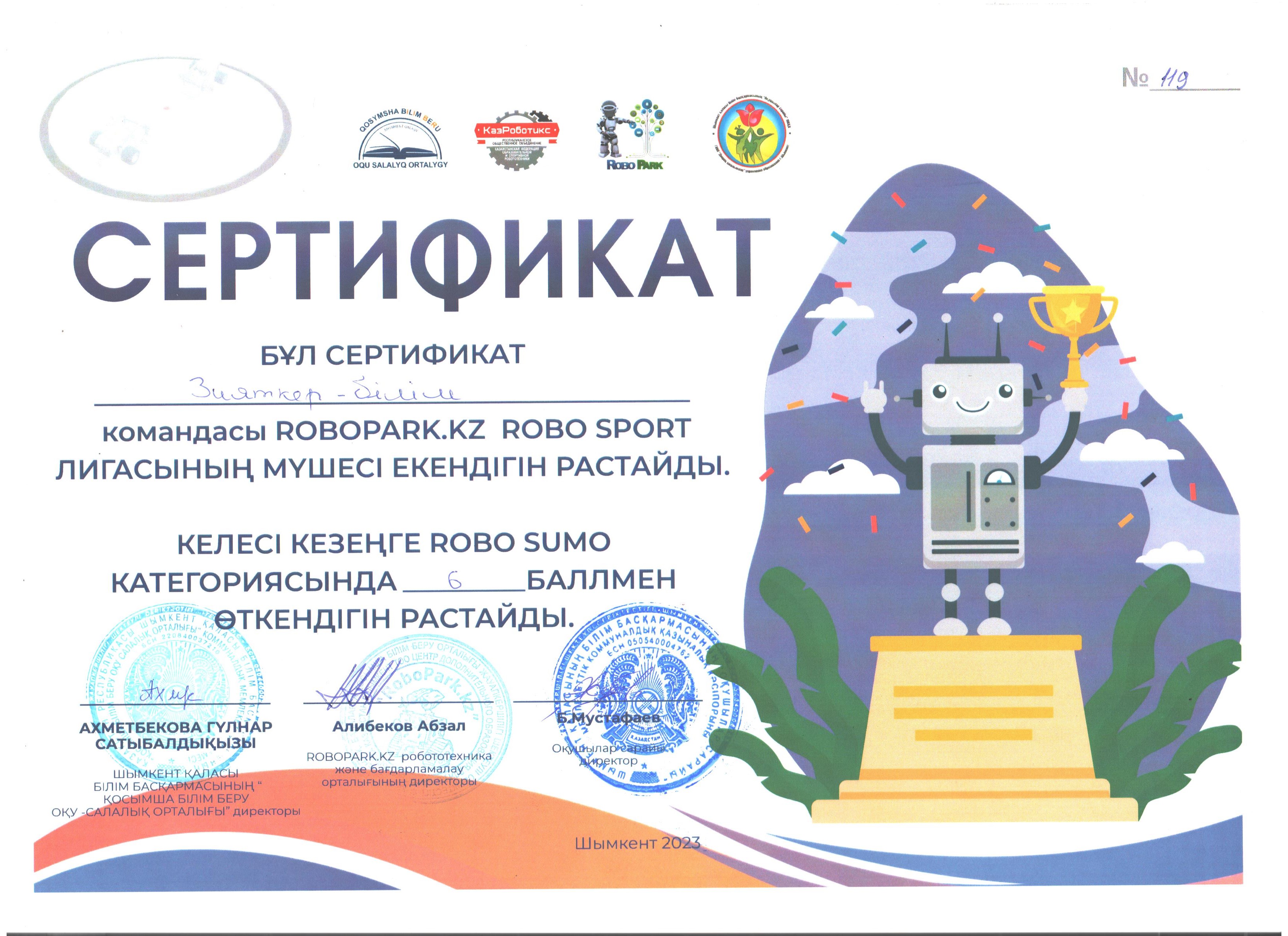 08 қазан 2023 0 1 2 3 4 5 ROBOPARK.KZ робототехника жарысының Зияткер-Білім мектебінің оқушылары ROBO SPORT лигасының мүшесі екендігін растайтын сертификат Робототехника жарысына дайындаған мұғалім Темірбек Нұрғиса ЗатыбекұлыЖарысқа қатысқан оқушылар:Қонысбек Айсұлтан және Бекжігіт Нұрасыл
