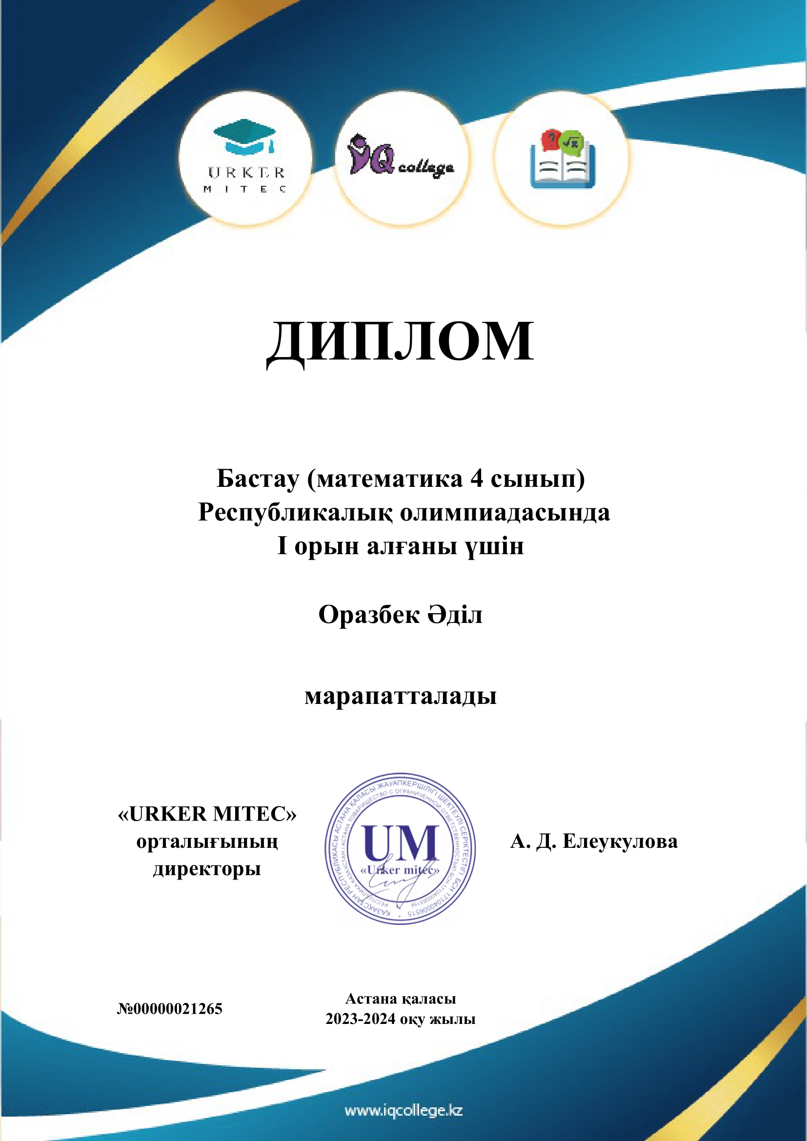 06 қазан 2023 0 1 2 3 4 5 Бастау (математика 4-сынып) Республикалық олимпиадасының I орын жүлдегерлері Оқушылар: