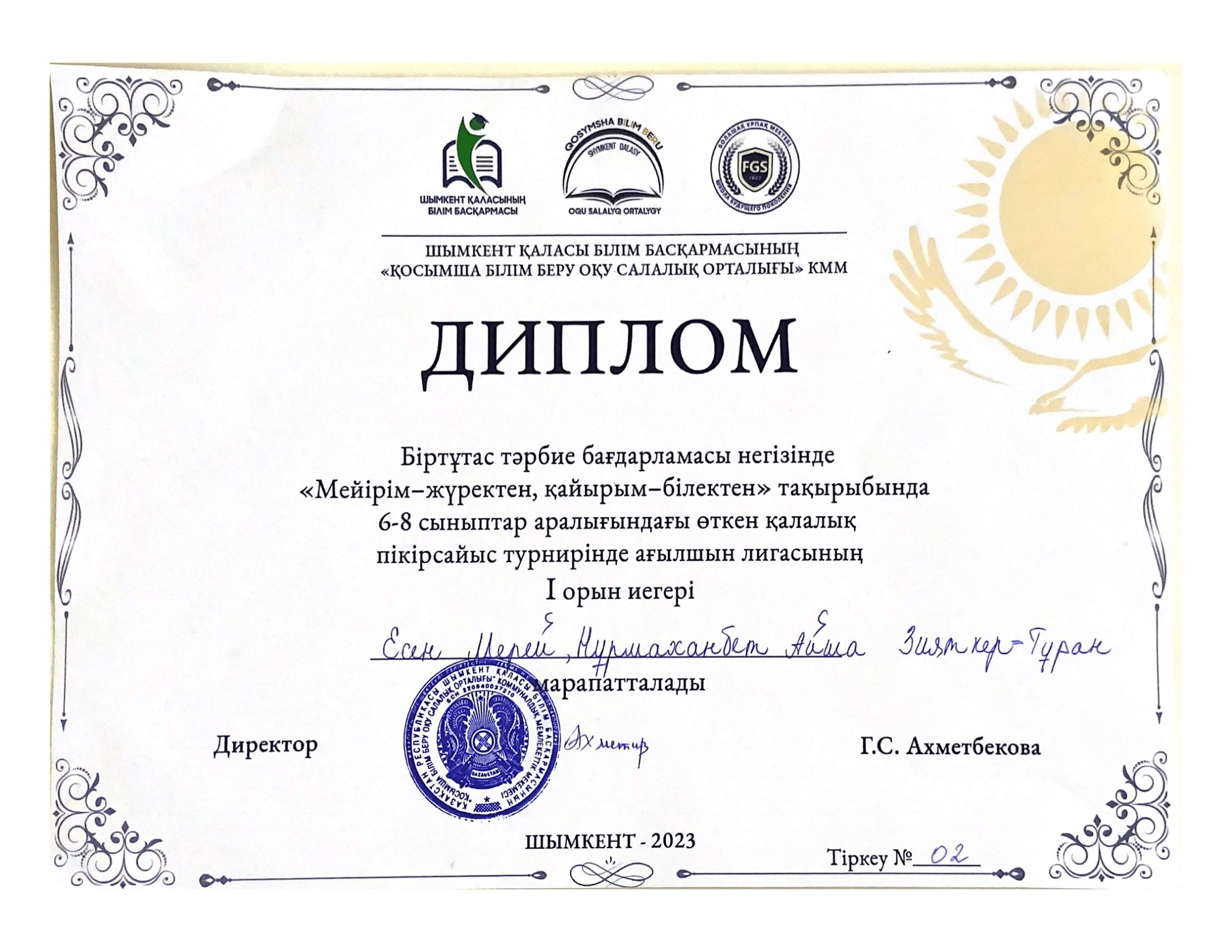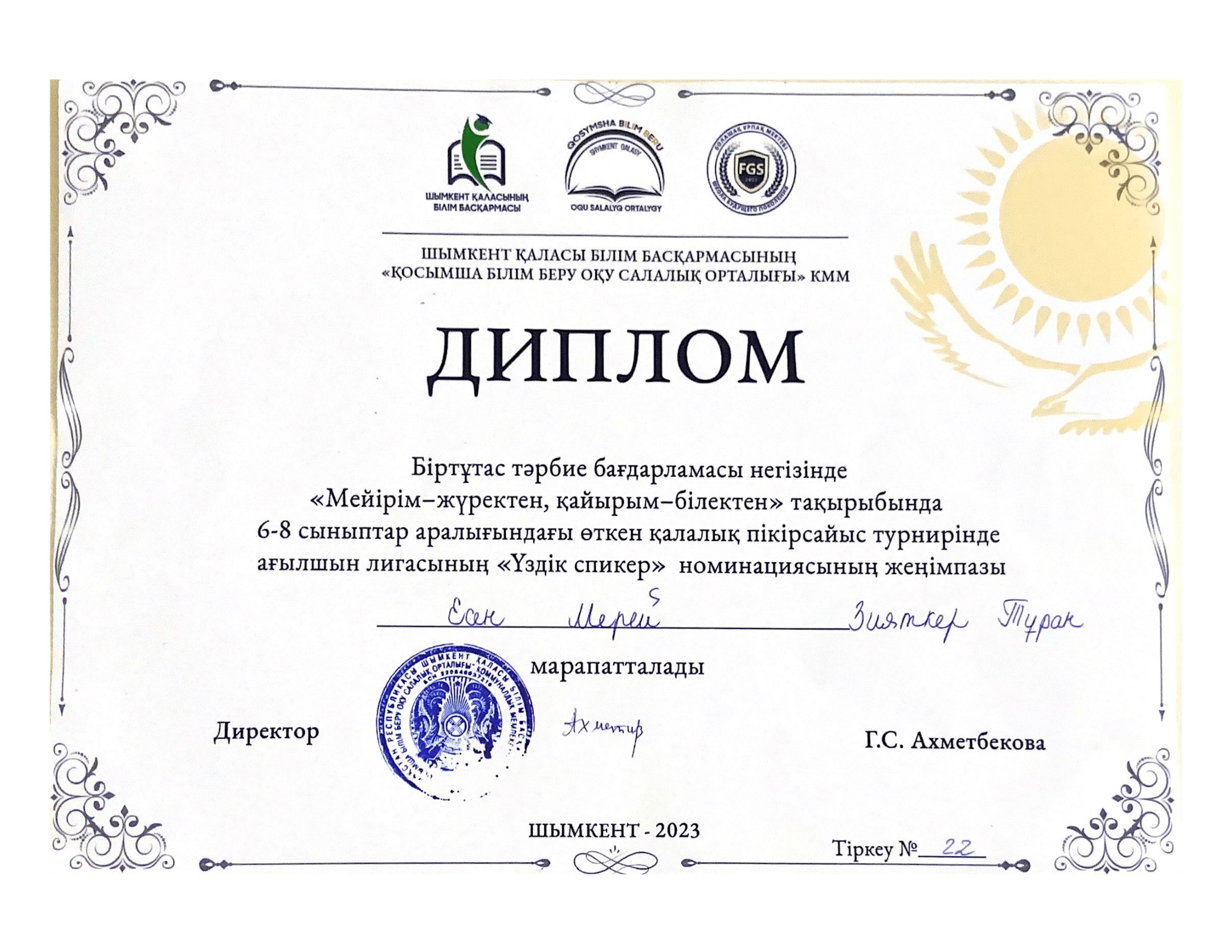 17 қараша 2023 0 1 2 3 4 5 "Мейірім-жүректен,қайырым-білектен" тақырыбында 6-8 сыныптар аралығында өткен қалалық пікірсайыс турнирі ағылшын лигасы I орын иегері:Үздік спикер: