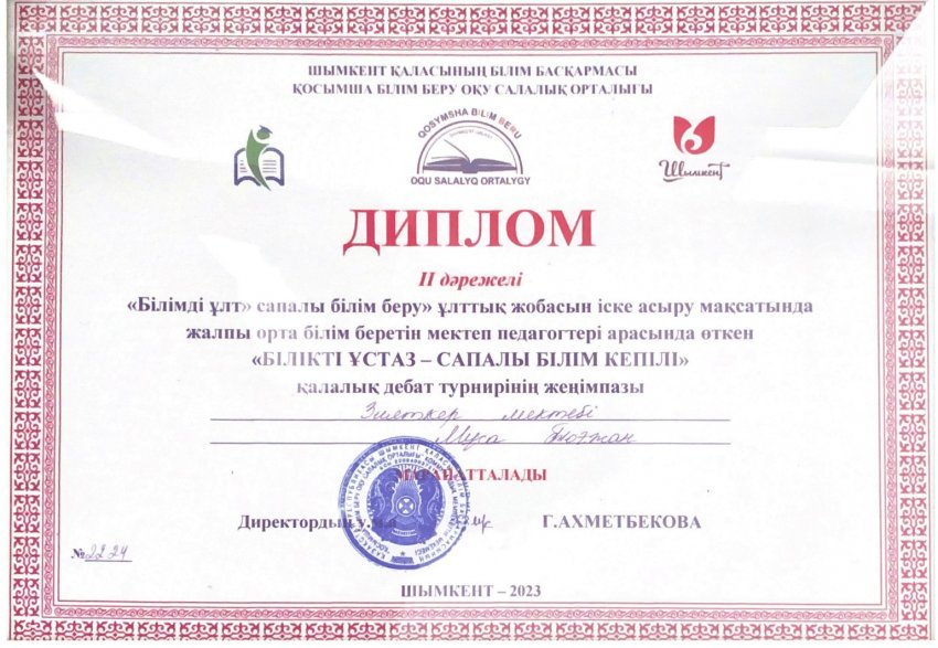 07 қыркүйек 2023 0 1 2 3 4 5 "БІЛІКТІ ҰСТАЗ - САПАЛЫ БІЛІМ КЕПІЛІ" қалалық дебат турнирінің жеңімпаздары "Зияткер-Білім" мектебінің қалалық турнирінің дебатына қатысып 2-ші дәрежелі диплом алған мұғалімдер: Мұса Тоғжан және Серікбаев Арынбай