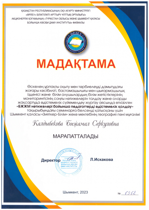 13 желтоқсан 2023 0 1 2 3 4 5 БЖЖМ нәтижелері бойынша педагогтерді әдістемелік қолдау Электронды нұсқа: bizhamal-serkulovna.pdf [796,84 Kb] (cкачиваний: 0) Посмотреть онлайн файл: bizhamal-serkulovna.pdf